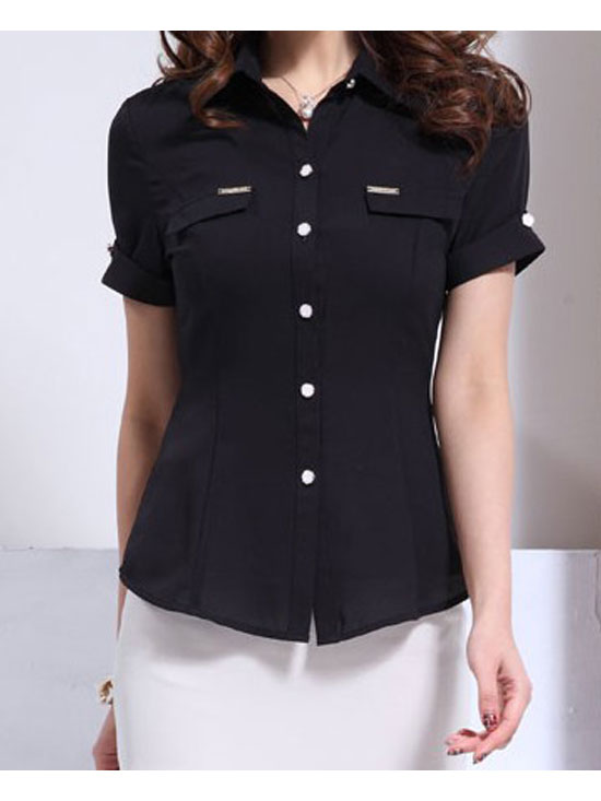 黑色中袖衬衣 黑色短袖衬衣 新款女装韩版免烫衬衣修身女长袖简约通勤OL职业白衬